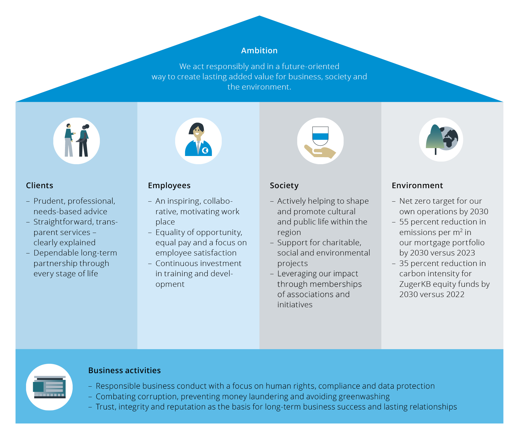 We think and act in a future-oriented way. We incorporate ecological and social aspects into our ambitious business objectives. In this way, we create responsible and sustainable added value for our clients, shareholders and employees, as well as for the Zug economic region and for the environment. As a company, we strive to be a sustainable bank with particular expertise in sustainable investments.